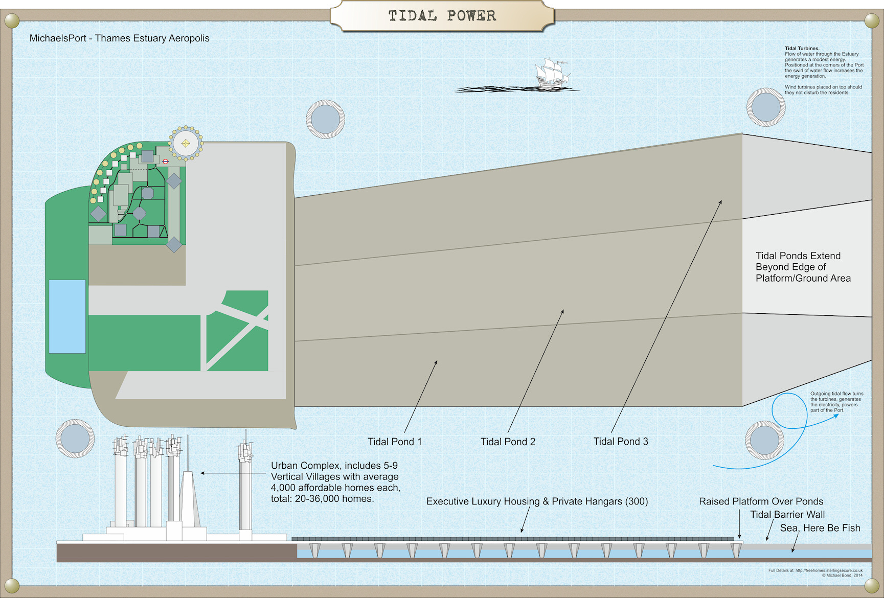 MichaelsPort is located offshore, not on the coastline or banks of the Thames and therefore offers another opportunity – to create tidal power basins in, under or around the island.